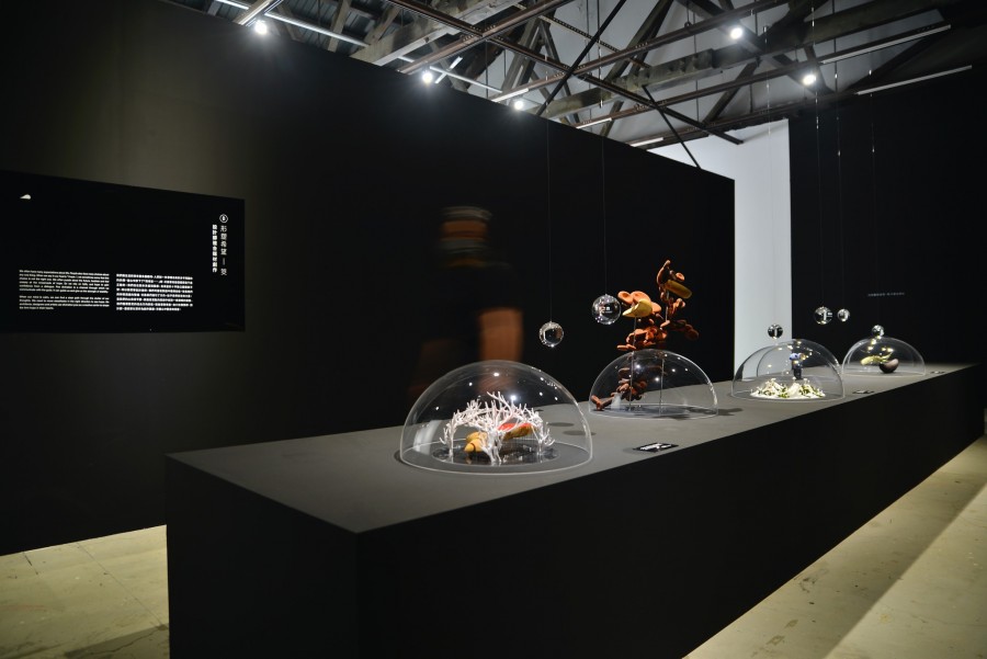 筊是道教信仰中,用來與神明溝通的儀式。在台灣人們將筊杯合扣,小心翼翼地握住,雖然聽不到祈願者的心聲,但能感受到向神明虔誠地訴說心中所想的心意。希望是珍貴的、是潛藏內心的,因此將此區設計為象徵自我內在的黑色空間,並用彷彿氣泡輕柔飄動的意象,將希望小心的包裹著。